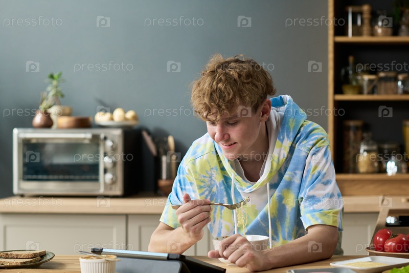 Мальчик-подросток съедает завтрак, глядя на планшет в кухне