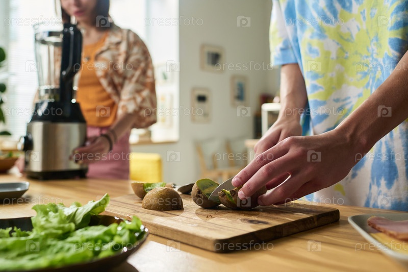 Молодой мальчик нарезает киви, в то время как девочка-подросток готовит смузи