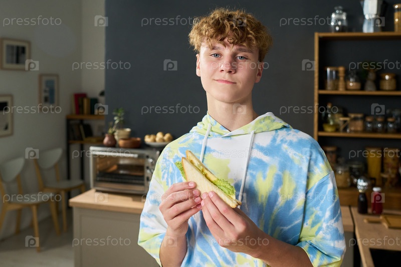 Портрет мальчика-подростка, держащего бутерброд на современной кухне