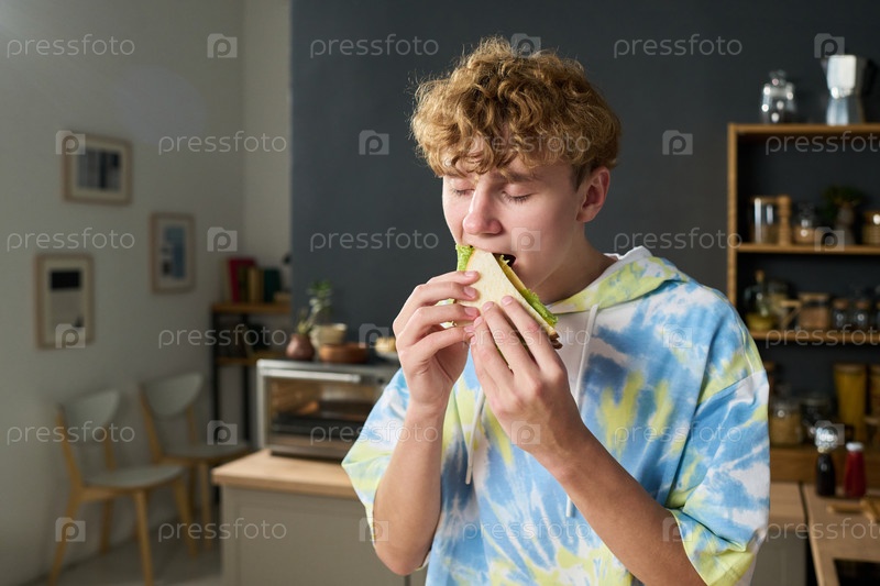 Мальчик-подросток наслаждается едой бутерброда на современной домашней кухне