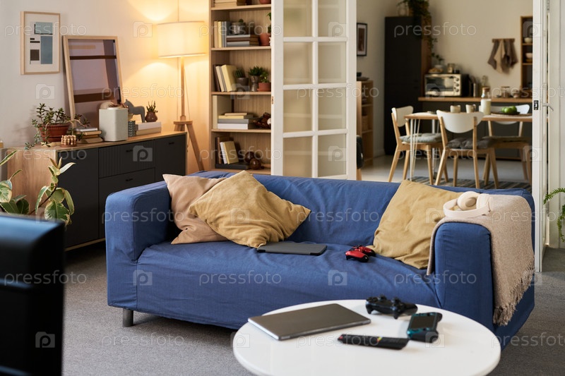 Гостиная с современными игровыми устройствами и ноутбуком на кофейном столе