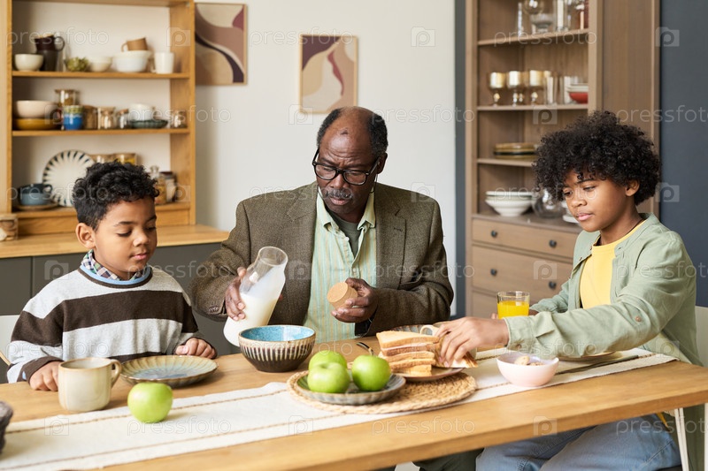 Черный мужчина наливает молоко двум черным старшеклассникам, завтракающим вместе