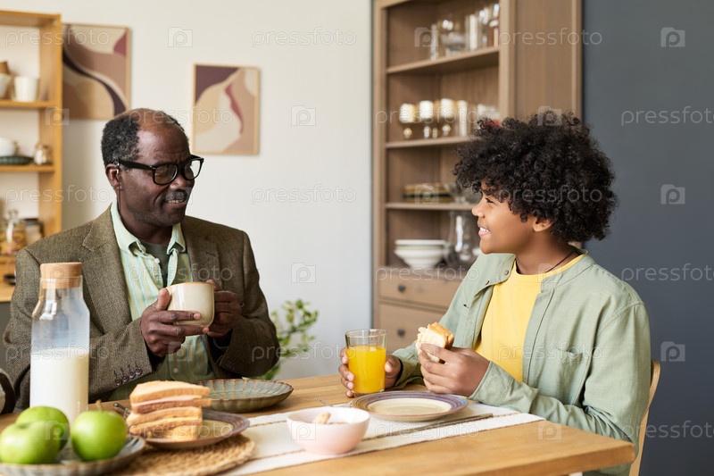 Зрелый чернокожий мужчина разговаривает с подростком-черным мальчиком во время завтрака