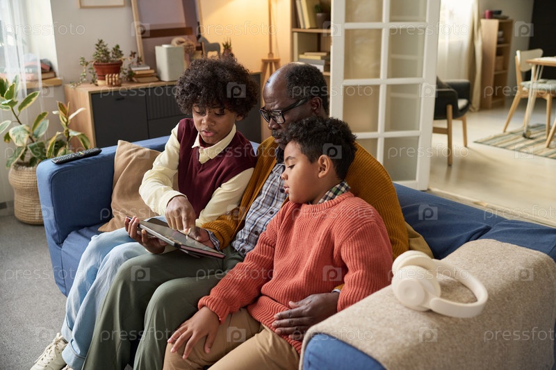 Зрелый чернокожий мужчина сидит с двумя детьми, используя цифровые планшеты вместе