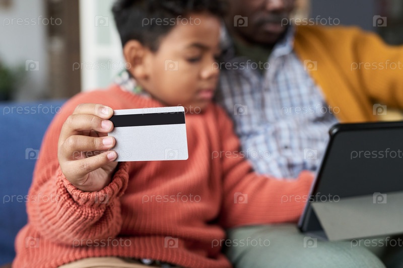 Черный мальчик держит кредитную карту, сидя с помощью планшета
