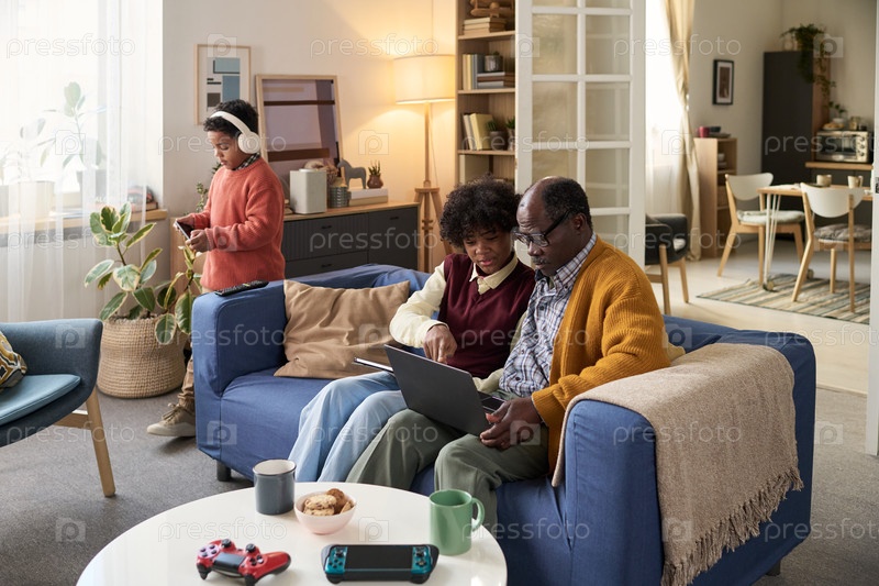 Мальчик и дедушка используют ноутбук, в то время как ребенок слушает музыку поблизости