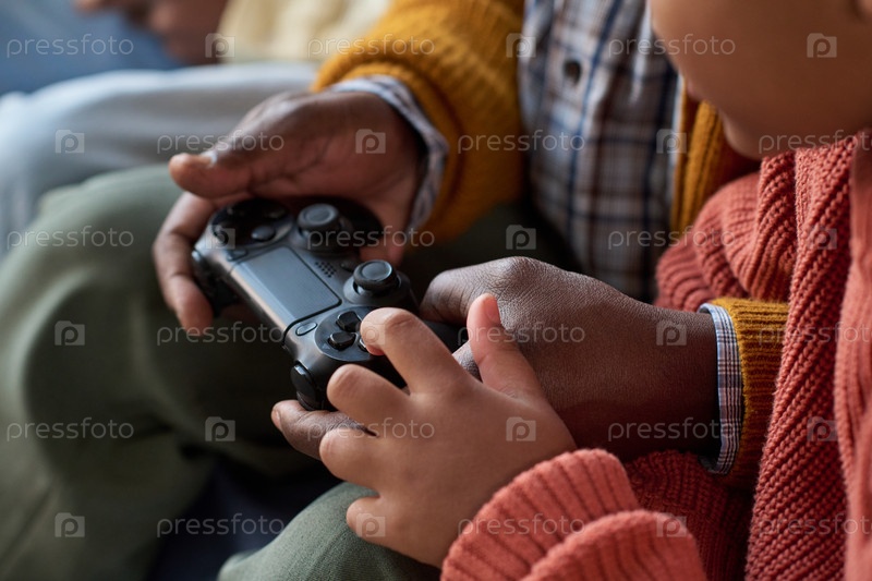 Черный ребенок и чернокожий мужчина играют в видеоигры вместе в помещении