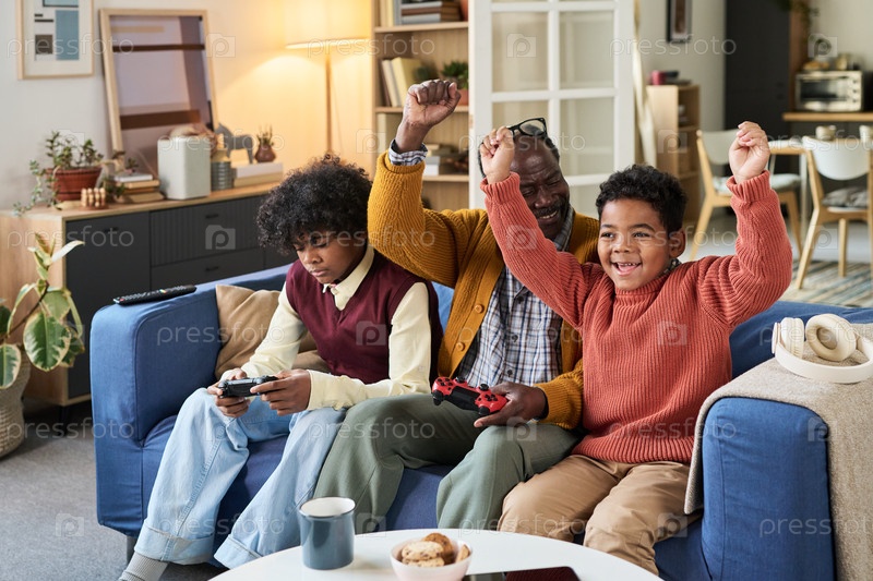 Чернокожий мужчина играет в видеоигры с двумя счастливыми зрелыми черными мальчиками