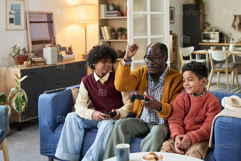 Чернокожий мужчина играет в видеоигру с двумя черными мальчиками на диване