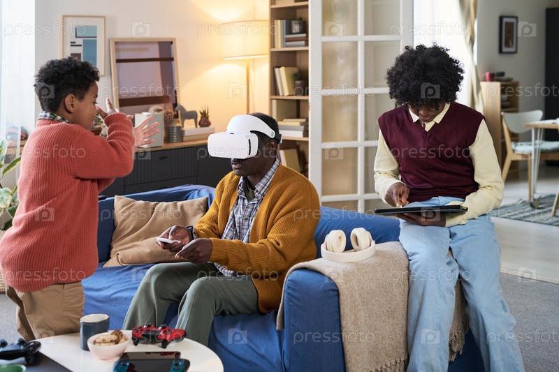 Мультиэтническая семья взаимодействует с виртуальной реальностью и планшетом в гостиной