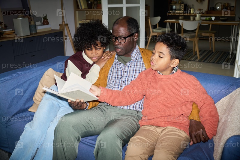 Чёрный мужчина читает книгу с двумя черными мальчиками на диване