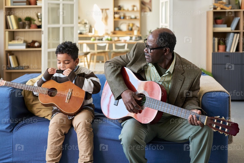 Чёрный мужчина учит мальчика играть на гитаре в уютной гостиной старшеклассника