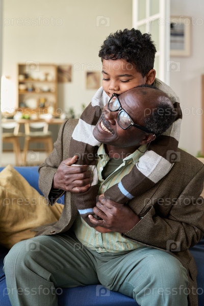 Чёрный мужчина улыбается, нося мальчика на плечах в помещении