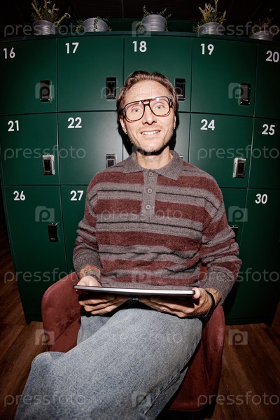 Портрет молодого взрослого мужчины, сидящего в современном офисе с планшетом