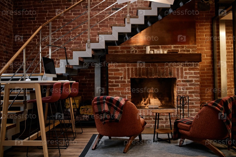 Современный бизнес-офисный салон с уютной сидячей зоной возле камина