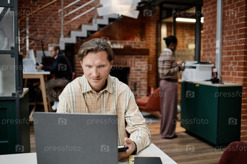 Мужчина средних лет использует ноутбук, в то время как коллеги работают в офисе