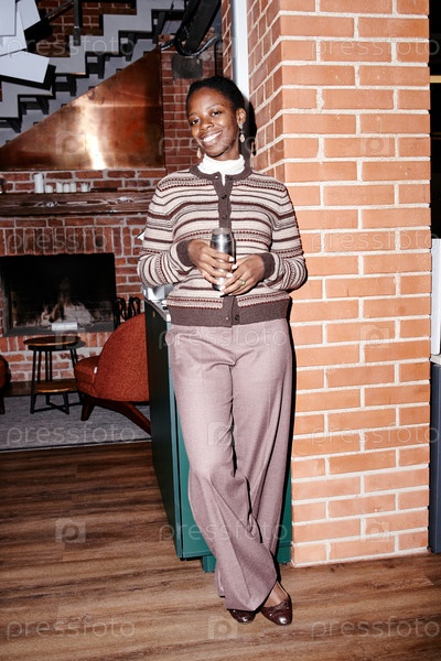 Портрет молодой взрослой чернокожей женщины, улыбающейся во время приема кофе в офисе