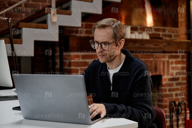 Мужчина средних лет работает на ноутбуке в современном офисе