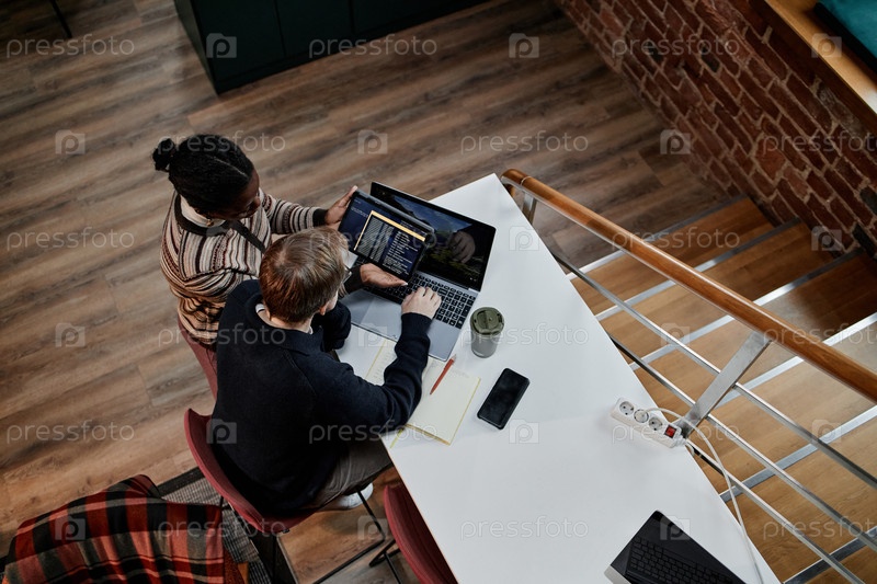 Молодые взрослые мультиэтнические коллеги сотрудничают на ноутбуке в современном офисе