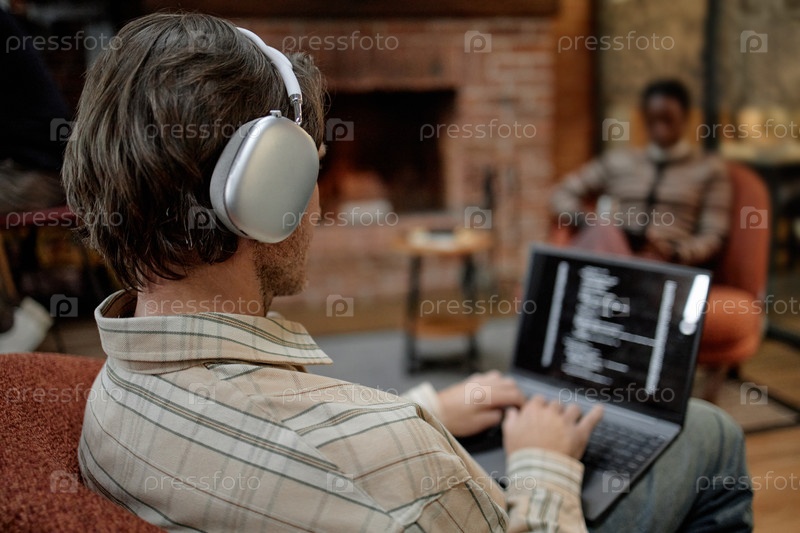 Молодой взрослый мужчина, использующий ноутбук и слушающий музыку в современном офисе