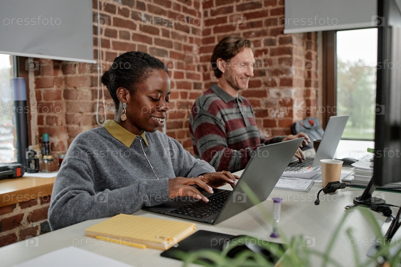 Молодая чернокожая женщина и мужчина среднего возраста работают в современном офисе