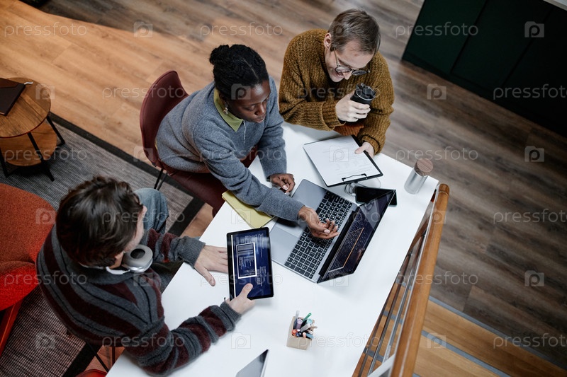 Различные молодые взрослые сотрудничают над проектом 'Использование ноутбука в современном офисе'