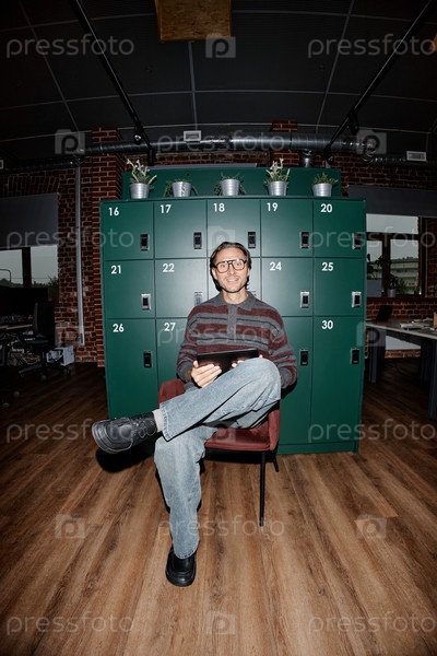 Портрет молодого взрослого человека, сидящего с планшетом в современном офисе