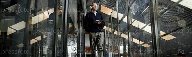 Header of Молодой человек ходит по современному бизнес-офису с помощью планшета