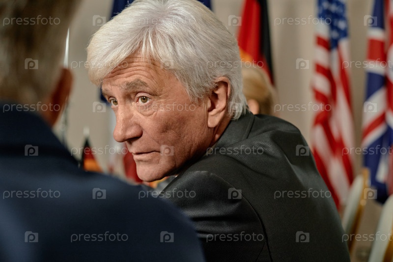 Старший мужчина посещает международную политическую встречу в помещении