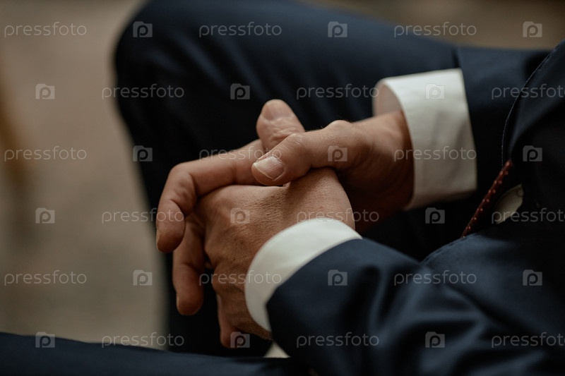Мужчина, сидящий с зажатыми руками во время совещания