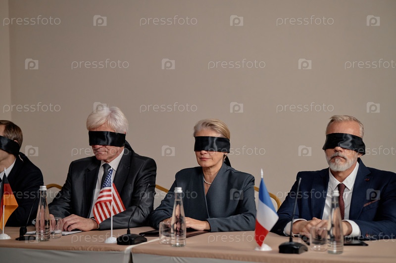 Дипломаты среднего возраста, сидящие с завязанными глазами за столом международной конференции