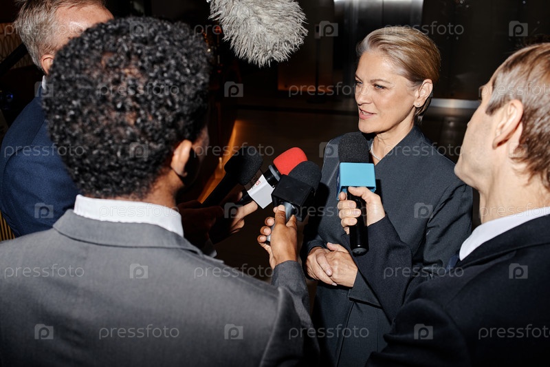 Женщина среднего возраста отвечает на вопросы во время пресс-интервью