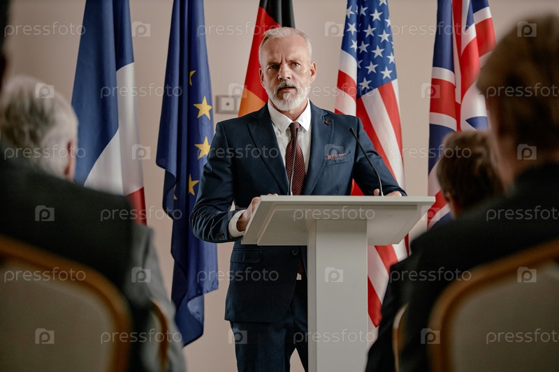 Старший человек, выступающий на подиуме во время международной конференции