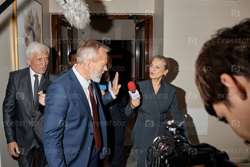 Старший мужчина жестикулирует во время интервью с женщиной среднего возраста