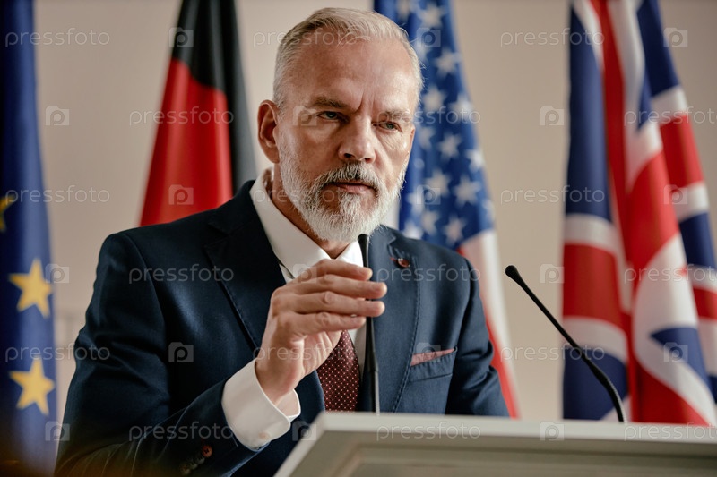 Человек среднего возраста выступает на международной политической конференции