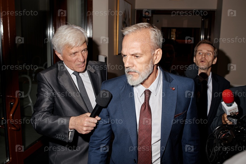 Мужчина среднего возраста идет мимо репортеров, держащих микрофоны в помещении
