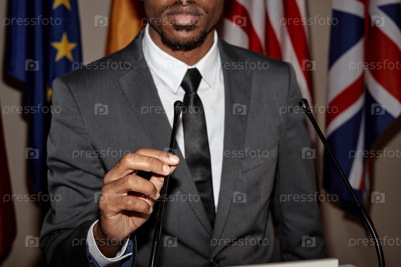 Чернокожий человек выступает на подиуме во время международной конференции