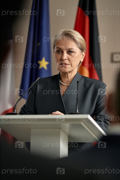 Старшая женщина, выступающая на подиуме во время политической пресс-конференции