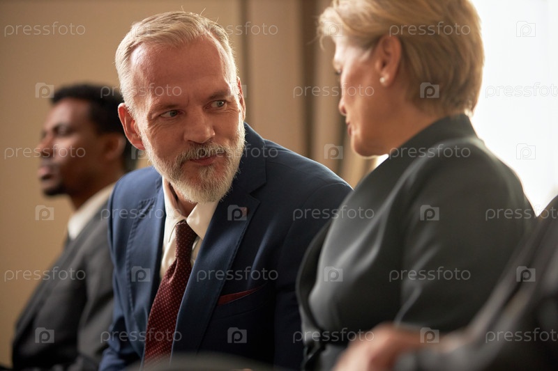 Мужчина средних лет улыбается, разговаривая с женщиной среднего возраста
