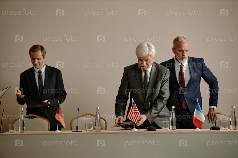 Мужчины среднего возраста готовятся к Международной политической конференции