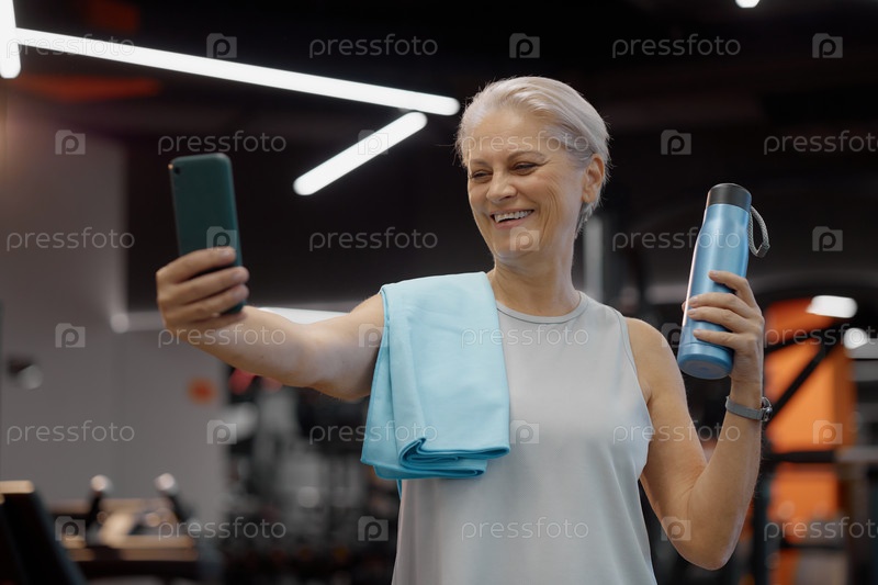 Женщина-старшеклассница улыбается, делая селфи после тренировок в спортзале