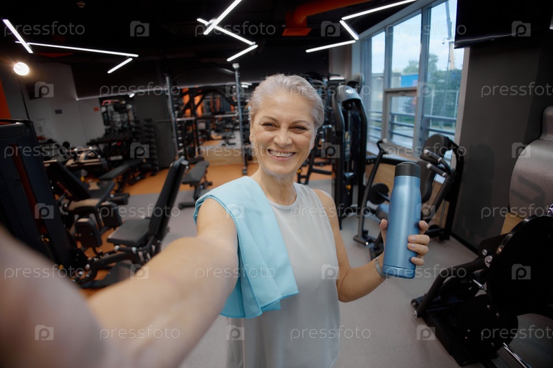 Портрет пожилой женщины, улыбающейся во время селфи в спортзале