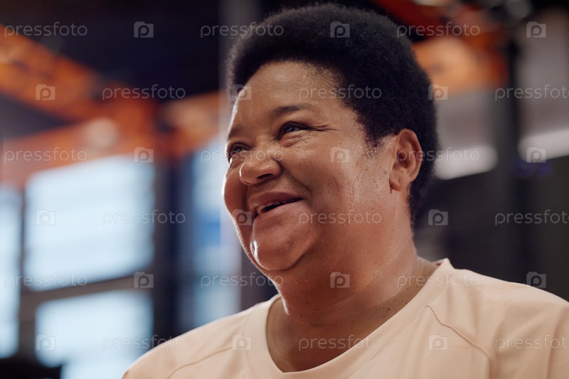 Портрет зрелой чернокожей женщины, улыбающейся в помещении во время разговора