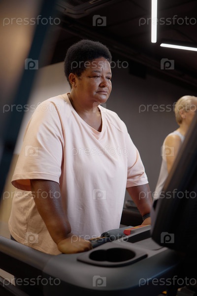 Зрелая чернокожая женщина использует беговую дорожку во время кардио тренировки в помещении