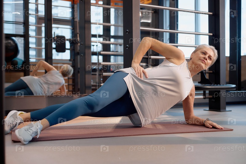 Старшая женщина, занимающаяся на йога-матке во время тренировки боковой доски