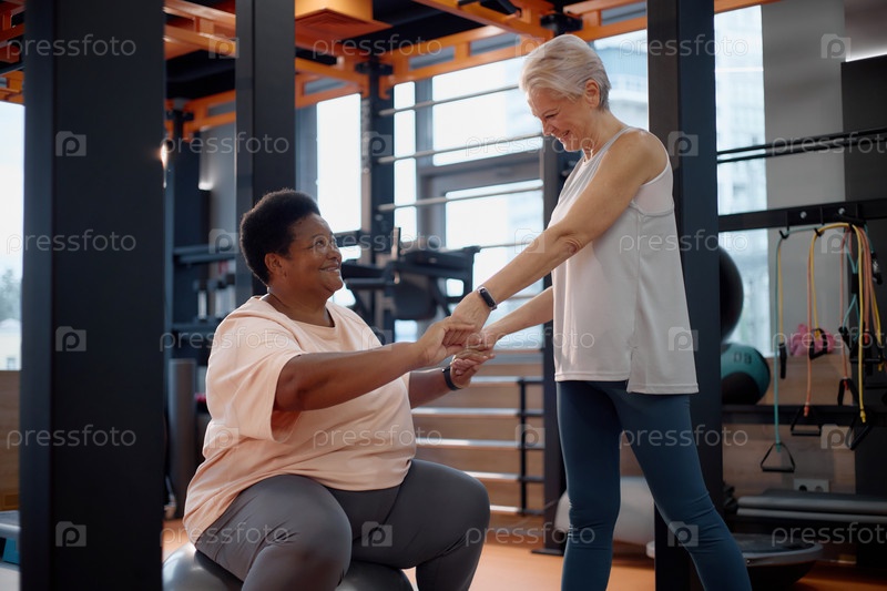 Пожилая женщина поддерживает чернокожую женщину среднего возраста, занимающуюся спортом в помещении