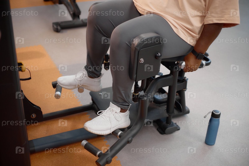 Женщина, тренирующая ноги на машине для занятий спортом во время тренировки