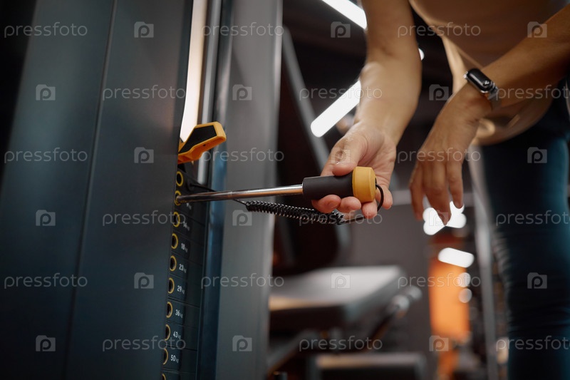 Женщина, регулирующая стек веса на машине для упражнений в спортзале