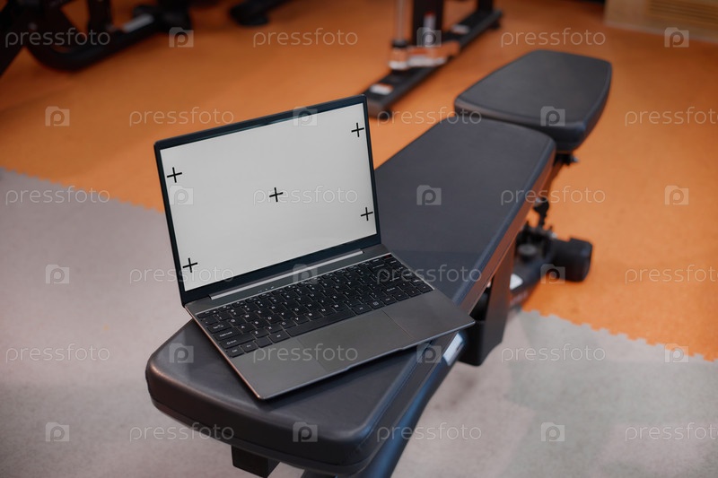 Ноутбук отображает пустой экран, отдыхающий на скамейке в фитнес-центре