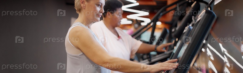 Зрелая женщина и ее друг тренируются на беговой дорожке